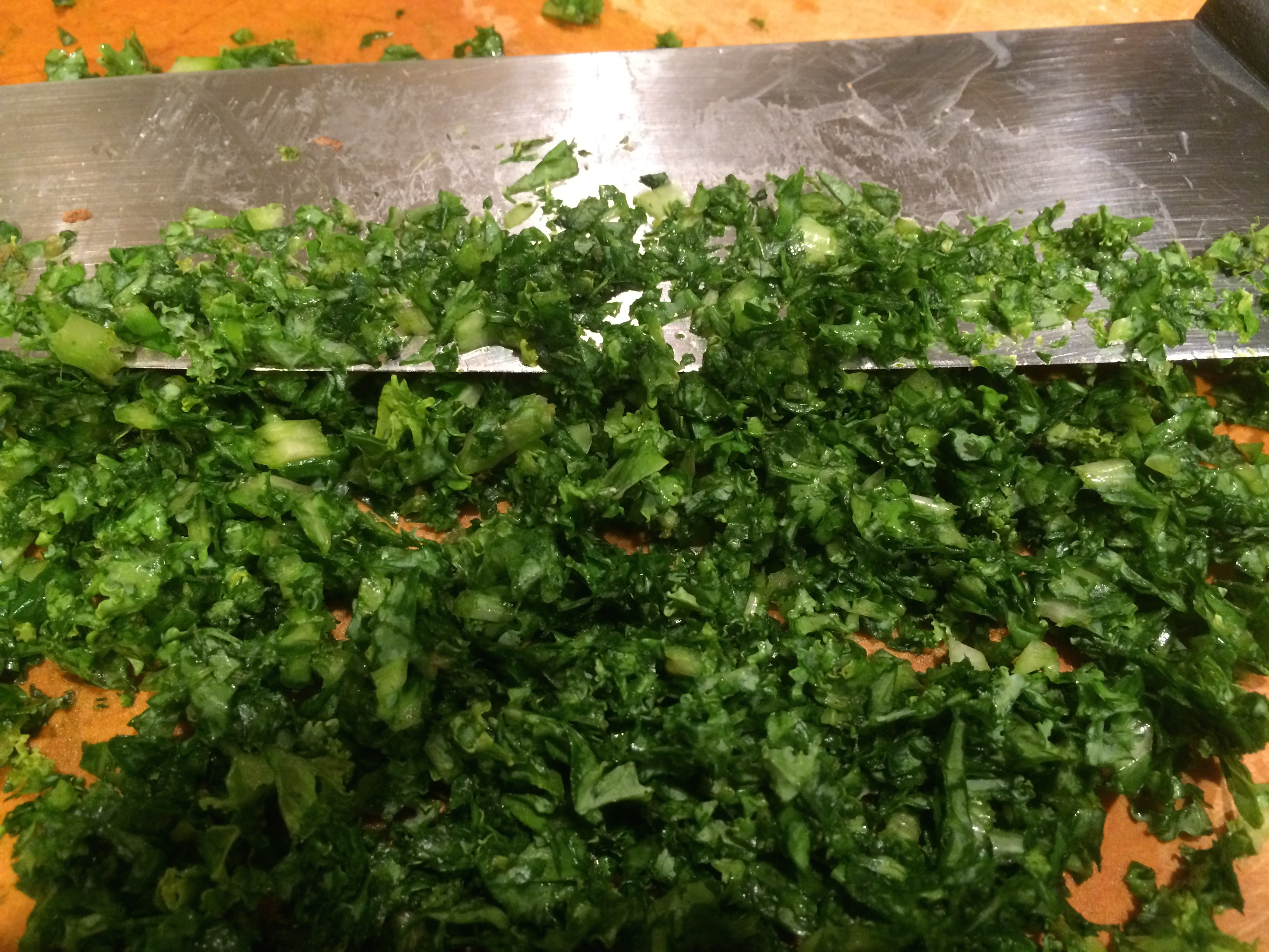 Chop the kale very very finely. This is the secret to making the dish kid-friendly. Use a large, sharp chef’s knife and try to chop like you see chefs chop on TV! You want the green pieces to be as small as you can chop them, like the way you might chop parsley. It takes a while, but eventually you’ll have a pile of fine green kale.IMG_2268